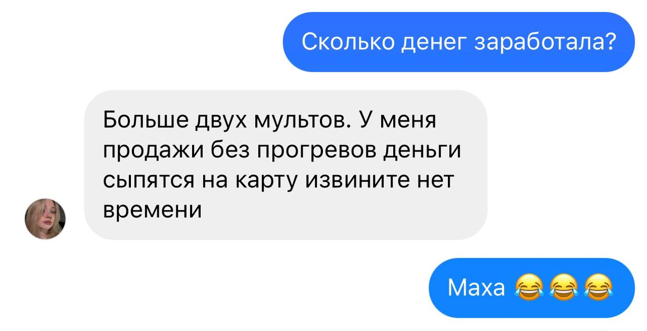 Ты легко могла бы зарабатывать минимум в 5 раз больше, если бы не втюхивала! 90% твоей прибыли лежит в людях, которые тебе доверяют, нужно просто уметь доводить их до этого состояния.